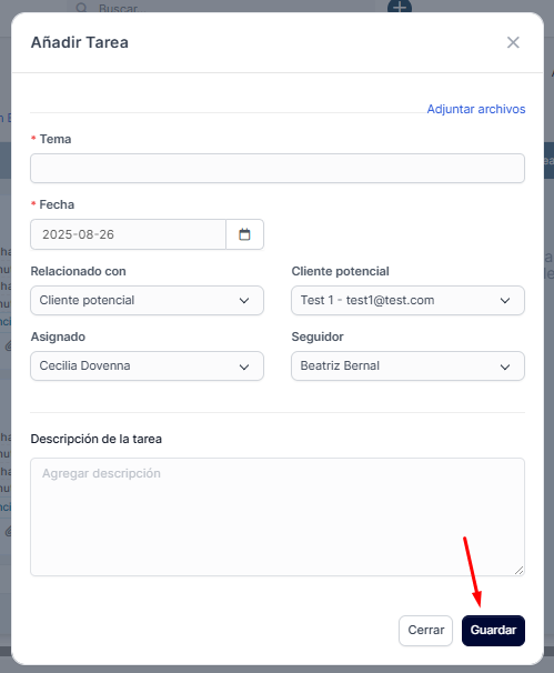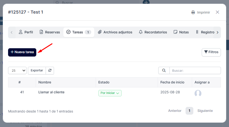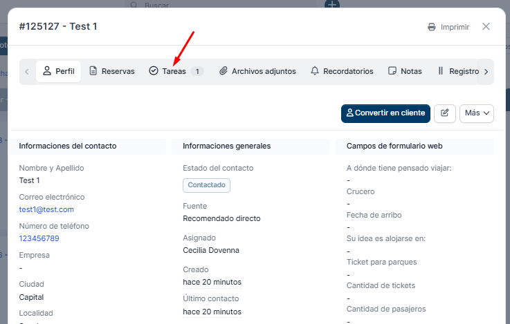 Desde el perfil del lead/cliente se puede acceder al apartado para crear tareas.